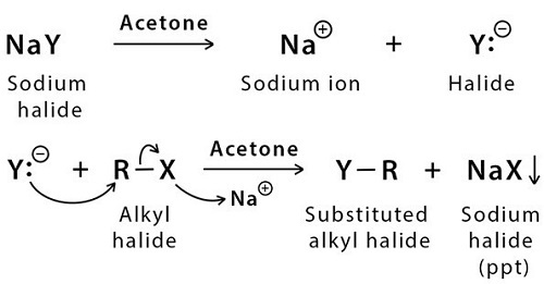 該反應非常有助於將烷基氯化物或溴化物轉化為烷基氟化物。 | 該反應主要將烷基氯化物或溴化物轉化為碘化物。 |