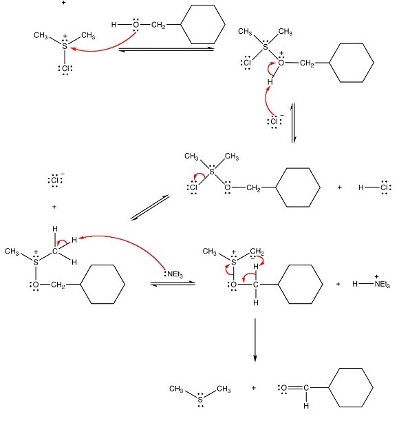 第二步顯示醇在氯(二甲基)硫鎓氯化物反應中的新增。這導致形成一氧化碳和二氧化碳作為副產物。