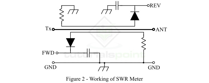 此 SWR 功率計由一個發射器 (Tx) 端子和一個天線 (ANT) 端子組成,它們透過傳輸線連線。此處,方向耦合器用於電磁耦合傳輸線。電阻器用於在一端終止傳輸線,而二極體用於線路的另一端進行修改。此處,電阻器有助於匹配傳輸線的特性阻抗,而二極體有助於將訊號的幅度更改為其相應的直流電壓,然後由濾波電容器對其進行平滑。