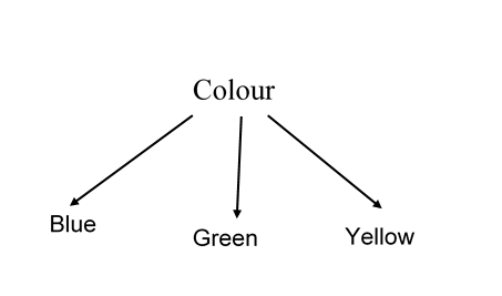 下位詞(Hyponym)− 在上述顏色的例子中,諸如黃色、綠色等單個顏色被稱為下位詞,它們更具體。