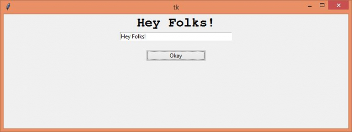 #Import the required Libraries from tkinter import * from tkinter import ttk #Create an instance of Tkinter frame win= Tk() #Set the geometry of Tkinter frame win.geometry("750x250") def display_text(): global entry string= entry.get() label.configure(text=string) #Initialize a Label to display the User Input label=Label(win, text="", font=("Courier 22 bold")) label.pack() #Create an Entry widget to accept User Input entry= Entry(win, width= 40) entry.focus_set() entry.pack() #Create a Button to validate Entry Widget ttk.Button(win, text= "Okay",width= 20, command= display_text).pack(pady=20) win.mainloop()