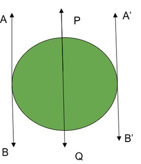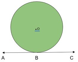 這是一個幾何表示,一個以 O 為圓心的圓在一個平面上的點 B 與直線 AC 相交。由於直線和圓的圓周只有一個公共點,因此 AC 成為圓的切線,B 為切點。這條直線位於圓的邊界之外。