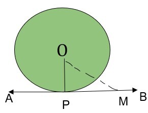證明:在以 O 為圓心的圓的切線 AB 上取一點 M。因為切線和圓只有一個公共點,即 P,所以該點 M 位於圓外。因此,OM 比 OP(圓的半徑)長。