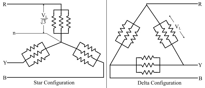 對於三相電路,當加熱元件連線成星形時,它會產生較少的熱量,而當連線成三角形時,它會產生更多的熱量。