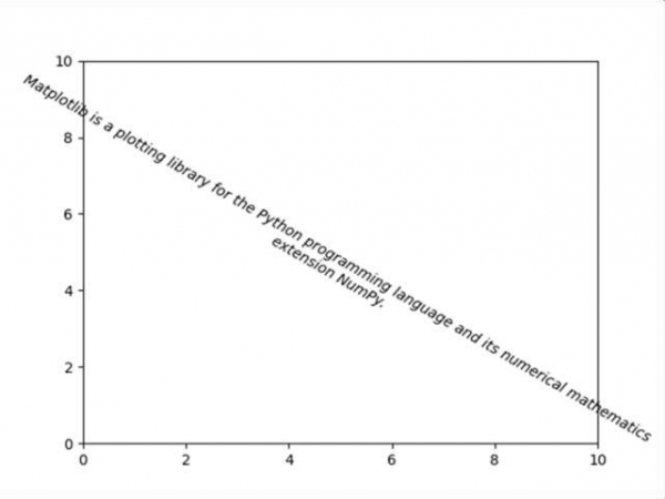 import matplotlib.pyplot as plt fig = plt.figure() plt.axis([0, 10, 0, 10]) input_text = 'Matplotlib is a plotting library for the Python programming language and its numerical mathematics extension NumPy.' plt.text(5, 5, input_text, fontsize=10, style='oblique', ha='center', va='top', wrap=True, rotation=-30) plt.show()