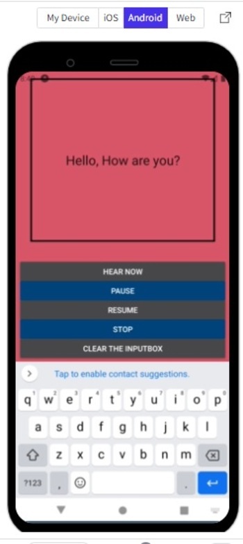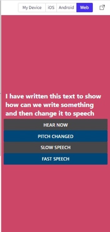 import{Component}from'react'; import{Text,View,StyleSheet,Button}from'react-native'; import*asSpeechfrom'expo-speech'; varmyNote='Ihavewrittenthistexttoshowhowcanwewritesomethingandthenchangeittospeech'; exportdefaultclassTextToSpeechNote1extendsComponent{ speakWhateverIsWritten=()=>{ Speech.speak(myNote); }; speechRateFast=()=>{ Speech.speak(myNote,{ rate:2, }); } speechRateSlow=()=>{ Speech.speak(myNote,{ rate:0.25, }); } speechPitchChange=()=>{ Speech.speak(myNote,{ pitch:3, }); } render(){ return( <Viewstyle={styles.mainSpace}> <Textstyle={styles.TextSty}>{myNote}</Text> <Buttontitle="HearNow"color="#474749"onPress={this.speakWhateverIsWritten}/> <Buttontitle="PitchChanged"color="#004677"onPress={this.speechPitchChange}/> <Buttontitle="SlowSpeech"color="#474749"onPress={this.speechRateSlow}/> <Buttontitle="FastSpeech"color="#004677"onPress={this.speechRateFast}/> </View> ); } } conststyles=StyleSheet.create({ mainSpace:{ flex:1, justifyContent:'center', backgroundColor:'#cc4668', padding:8, }, TextSty:{ color:'white', fontWeight:"bold", fontSize:20, margin:5, alignItems:"center", }, });