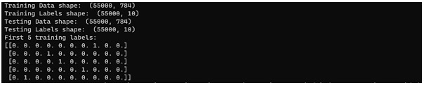 from tflearn.datasets import mnist x_train, y_train, x_test, y_test=mnist.load_data(one_hot=True) print("Training Data shape: ", x_train.shape) print("Training Labels shape: ", y_train.shape) print("Testing Data shape: ", x_train.shape) print("Testing Labels shape: ", y_train.shape) print("First 5 training labels: ") print(y_train[:5])