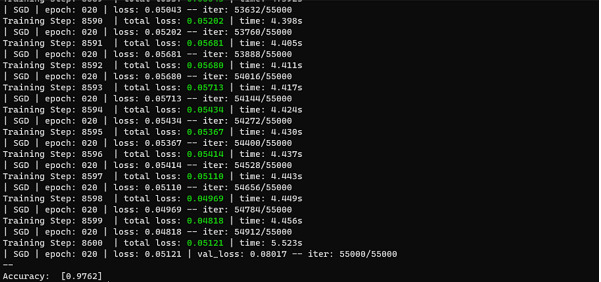 import tflearn from tflearn.datasets import mnist x_train, y_train, x_test, y_test=mnist.load_data(one_hot=True) print("Training Data shape: ", x_train.shape) print("Training Labels shape: ", y_train.shape) print("Testing Data shape: ", x_train.shape) print("Testing Labels shape: ", y_train.shape) print("First 5 training labels: ") print(y_train[:5]) i_layer=tflearn.input_data(shape=[None,784]) h_layer=tflearn.fully_connected(i_layer, 256, activation='relu') o_layer=tflearn.fully_connected(h_layer, 10, activation='softmax') net=tflearn.regression(o_layer, optimizer='sgd', learning_rate=0.1, loss='categorical_crossentropy') model=tflearn.DNN(net) model.fit(x_train, y_train, validation_set=(x_test,y_test), n_epoch=20, batch_size=128) acc=model.evaluate(x_test,y_test) print("Accuracy: ", acc)