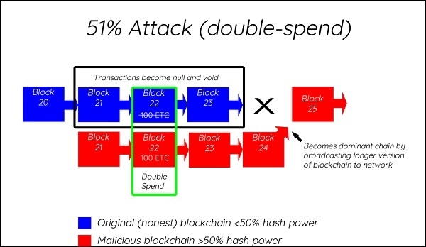簡單來說,如果單個礦工或礦工池控制著加密貨幣網路超過 50%(例如 51%)的挖礦雜湊算力,他們就可以攻擊區塊鏈網路並撤銷交易。一旦他們擁有超過 50% 的雜湊算力,他們就可以控制加密貨幣網路,並且可以進行雙重支付。
