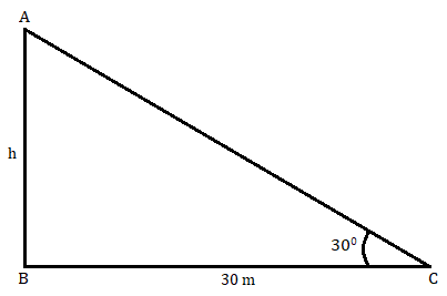 從地面上一點到塔頂的仰角為 30°,該點距塔底 30 米。求塔高。