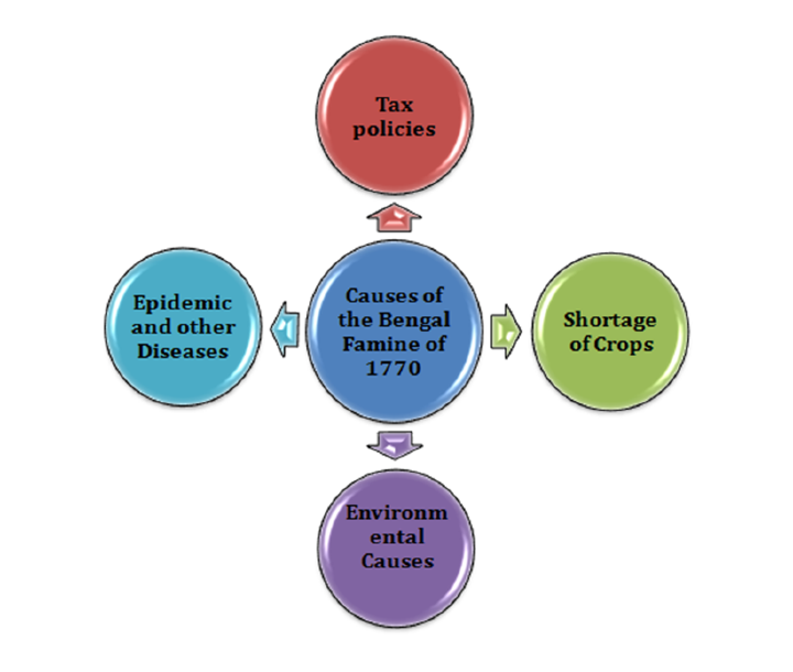 1770年孟加拉大饑荒發生在孟加拉和比哈爾邦的部分地區,但損失是由整個印度承擔的。除了英國因稅收政策造成的壓迫外,還有其他環境原因導致了這場饑荒。1770年夏季,由於飢餓而死的人已經開始出現,季風也隨之而來。令人驚訝的是,季風並沒有改變現狀,反而使情況惡化。許多未知的和廣泛傳播的疾病隨著季風而來,死亡人數上升。這場饑荒的結果是可怕的,因為某些村莊的人口急劇增加,而有些地方則幾乎成為死地。
