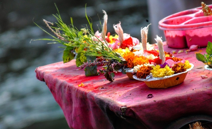 **圖片 2** − 供奉在寺廟的花朵,通常可見於印度大多數寺廟外。(來源:28Shrutyy,印度的粉紅色海軍藍,CC BY-SA 4.0)