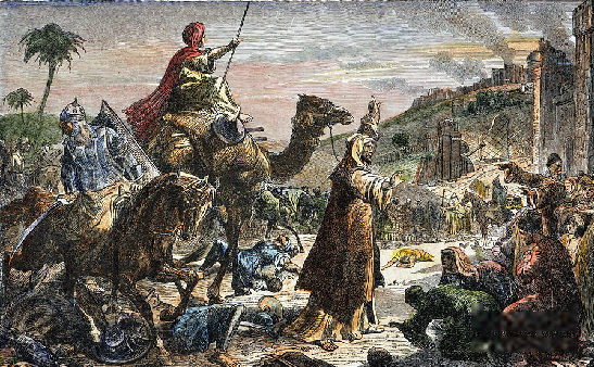 公元638年,哈里發歐麥爾(581?-644)進入耶路撒冷——19世紀彩色版畫