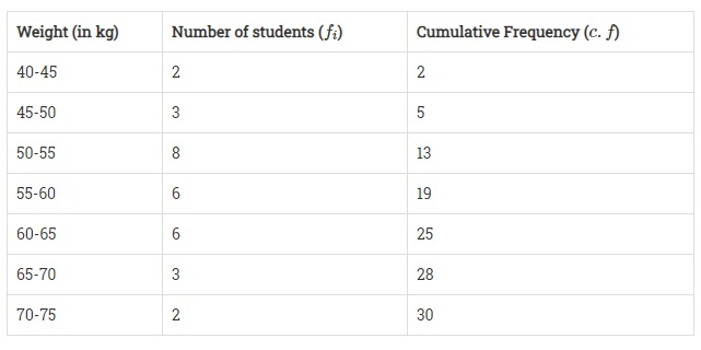 下面的分佈給出了一個班級30名學生的體重。求這些學生的體重中位數。