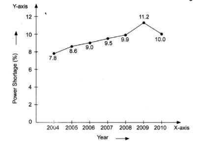 下表顯示了印度 2004 年至 2010 年的總電力短缺情況。請將資料以圖形的形式表示出來。將各年的短缺百分比繪製在 y 軸上,年份繪製在 x 軸上。