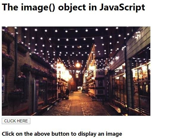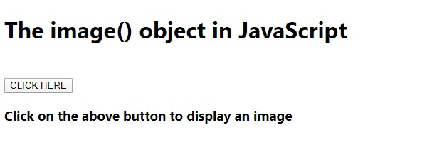 <!DOCTYPE html> <html lang="en"> <head> <meta charset="UTF-8" /> <meta name="viewport" content="width=device-width, initial-scale=1.0" /> <title>Document</title> <style> body { font-family: "Segoe UI", Tahoma, Geneva, Verdana, sans-serif; } .result { font-size: 18px; font-weight: 500; color: rebeccapurple; } </style> </head> <body> <h1>The image() object in JavaScript</h1> <div class="result"><br /></div> <button class="Btn">CLICK HERE</button> <h3>Click on the above button to display an image</h3> <script> let resEle = document.querySelector(".result"); let BtnEle = document.querySelector(".Btn"); let newImage = new Image(500, 300); newImage.src = "https://i.picsum.photos/id/195/536/354.jpg"; BtnEle.addEventListener("click", () => { resEle.appendChild(newImage); }); </script> </body> </html>