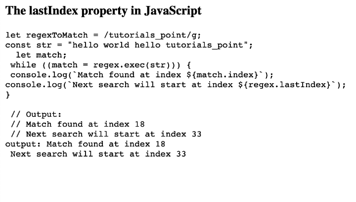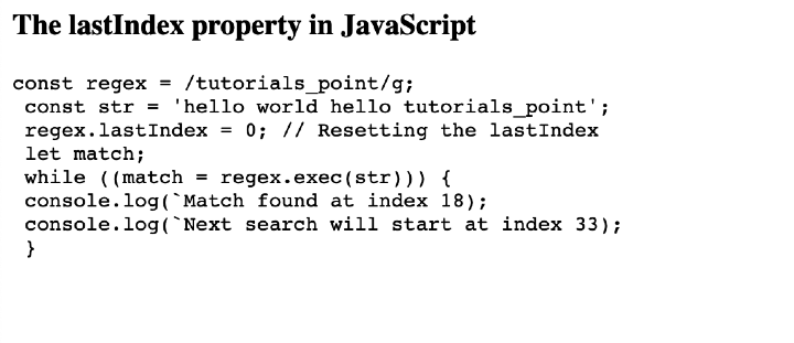code.innerHTML = `const regex = /tutorials_point/g; <br> const str = 'hello world hello tutorials_point'; <br> regex.lastIndex = 0; // Resetting the lastIndex <br> let match; <br> while ((match = regex.exec(str))) { <br> console.log(\`Match found at index 18); <br> console.log(\`Next search will start at index 33); <br> } `;