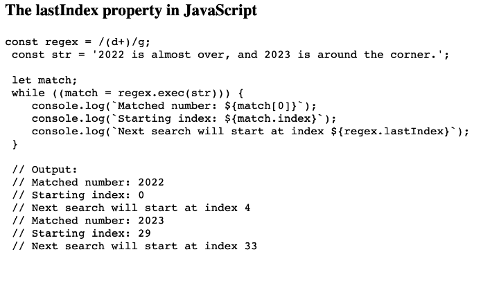 code.innerHTML = `const regex = /(\d+)/g; <br> const str = '2022 is almost over, and 2023 is around the corner.'; <br> <br> let match; <br> while ((match = regex.exec(str))) { <br> console.log(\`Matched number: \${match[0]}\`); <br> console.log(\`Starting index: \${match.index}\`); <br> console.log(\`Next search will start at index \${regex.lastIndex}\`); <br> } <br> <br> // Output: <br> // Matched number: 2022 <br> // Starting index: 0 <br> // Next search will start at index 4 <br> // Matched number: 2023 <br> // Starting index: 29 <br> // Next search will start at index 33`;