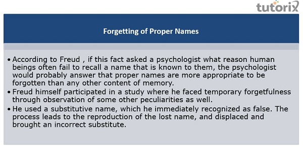 弗洛伊德從 1898 年發表的一篇關於遺忘的心理機制的短文開始進一步討論這一事實。在他看來,如果這一事實詢問一位心理學家為什麼人類經常無法回憶起他們所知的姓名,心理學家可能會回答說,與任何其他記憶內容相比,專有名詞更容易被遺忘。弗洛伊德本人也參與了一項研究,透過觀察其他特殊情況來面對暫時的遺忘。不僅存在遺忘,而且還存在錯誤的回憶。他使用了替代名稱,並立即認識到它是錯誤的。這個過程導致了丟失名稱的再現,取代並創造了一個不正確的替代品。他使用一個熟悉的名稱作為被遺忘名稱的替代名稱之一。他說,一旦遇到這種情況,他再也不會將這個名稱視為偶然事件而忘記。這種遺忘可能是由於忘記該名稱的某種傾向、不久前發生的壓抑過程以及相關名稱與先前被壓抑元素之間存在外部關聯的可能性。除了遺忘姓名之外,另一種遺忘也受壓抑的影響。