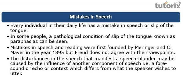 每個人在日常生活中都會犯言語錯誤或口誤。在某些人中,可以看到一種被稱為言語錯亂的口誤的病理狀況。Meringer 和 C. Mayer 在 1895 年首次發現了言語和閱讀錯誤,但弗洛伊德不同意他們的觀點。弗洛伊德說,遺忘姓名也部分導致了言語錯誤。導致言語錯誤的言語障礙可能是由言語的另一個組成部分的影響造成的,即前音或回聲或語境,這與說話者想要說出的內容不同。根據弗洛伊德的說法,正常人的口誤主要是由於潛意識造成的。弗洛伊德說,言語錯誤是預期言語的某些東西的干擾影響的結果。口誤是日常生活中非常普遍的問題。一些理論家提出了幾種型別的弗洛伊德式口誤:壓抑、精神錯誤和迴避。言語錯誤可能與我們的大腦處理語言的方式有關。人們在說話前總是會編輯詞語並監控錯誤或不合適的語言。此過程持續不斷。弗洛伊德式口誤發生在該過程失敗並且錯誤在被大腦捕捉到之前就溜出來的時候。口誤發生在人們說的每 1000 個詞中。根據一個人說話的多少,這相當於在平均每天發生 7 到 22 次口誤。有時口誤會令人尷尬,這種弗洛伊德式口誤更有可能是由於習慣而不是某些更深層次的隱藏含義造成的。