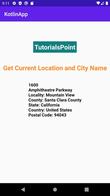 <?xml version="1.0" encoding="utf-8"?> <RelativeLayout xmlns:android="http://schemas.android.com/apk/res/android" xmlns:tools="http://schemas.android.com/tools" android:layout_width="match_parent" android:layout_height="match_parent" android:padding="4dp" tools:context=".MainActivity"> <TextView android:id="@+id/text" android:layout_width="wrap_content" android:layout_height="wrap_content" android:layout_centerHorizontal="true" android:layout_marginTop="70dp" android:background="#008080" android:padding="5dp" android:text="TutorialsPoint" android:textColor="#fff" android:textSize="24sp" android:textStyle="bold" /> <TextView android:layout_width="fill_parent" android:layout_height="wrap_content" android:layout_below="@+id/text" android:layout_centerHorizontal="true" android:layout_marginTop="40dp" android:text="Get Current Location and City Name" android:textAlignment="center" android:textColor="@android:color/holo_orange_dark" android:textSize="24sp" android:textStyle="bold" /> <TextView android:id="@+id/textView" android:textColor="@android:color/background_dark" android:layout_width="wrap_content" android:layout_height="wrap_content" android:layout_centerInParent="true" android:textSize="16sp" android:textStyle="bold" /> </RelativeLayout>