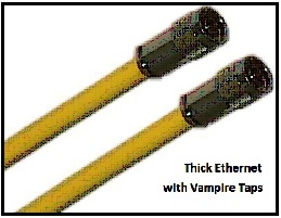 粗纜乙太網是首個商用化的以太網布線形式。它的技術名稱是 10-BASE-5。其中,10 表示最大吞吐量,即 10 Mbps;BASE 表示使用基帶傳輸;5 表示最大段長度為 500 米(1600 英尺)。這種型別的佈線允許透過吸血式接頭連線 100 個站點。