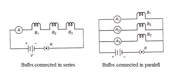 $(b)$. 如果一個燈泡燒壞,串聯連線的整個電路就會斷路。因此,電流不會流過燈泡。串聯連線的所有三個燈泡都會停止發光。在並聯連線中,情況有所不同。即使一個燈泡燒壞,電流也會繼續流過另外兩個燈泡。因此,在並聯連線中,另外兩個燈泡會繼續發光。