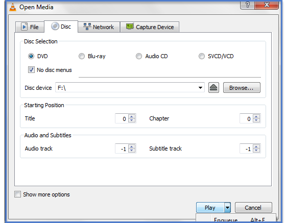 為此,請轉到媒體 -> 轉換/儲存光碟選項卡。在光碟選擇中,選擇要用於錄製的媒體光碟,選中“無光碟選單”,選擇光碟裝置,然後單擊轉換/儲存。選擇要儲存的編解碼器,並使用與你的編解碼器匹配良好的副檔名儲存。