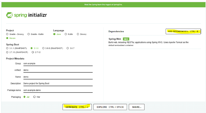 步驟 2 - 我們將藉助 Spring Initializr 建立一個 Spring Boot 專案。要開始建立 Spring Boot 專案,請點選連結。確保透過輸入相關資料準確填寫所有欄位。最後,按下下方標記為“GENERATE”的按鈕。結果,將下載一個包含 Spring Boot 專案的壓縮 zip 檔案。在您的系統上解壓縮下載的檔案中的資料夾。