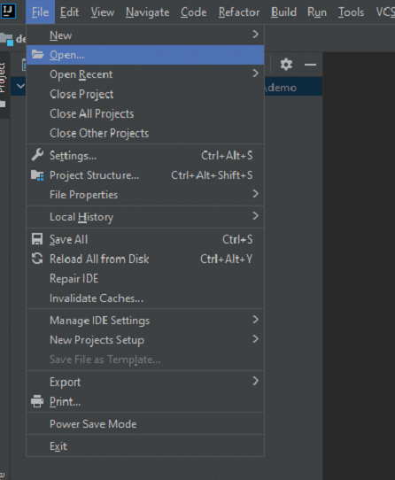 開啟 IntelliJ IDE -> 轉到檔案 -> 選擇下圖所示的開啟。
