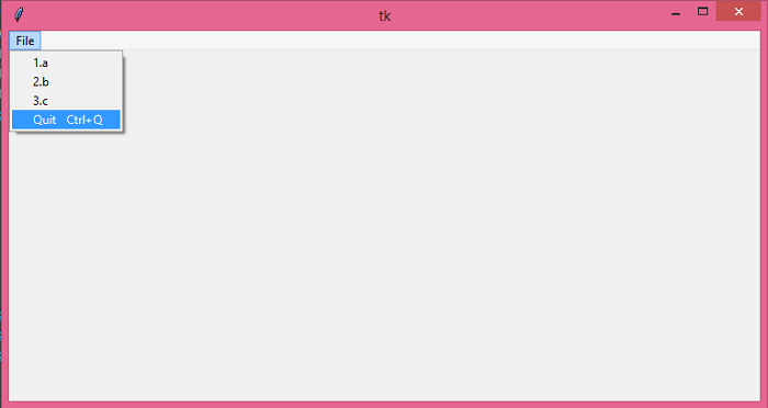 下拉菜單隻不過是垂直堆疊的一系列選單項,可以在應用程式頂部選單欄中顯示。我們可以透過建立 Menu() 的物件(其中包含所有選單項)在 Tkinter 應用程式中建立一個選單欄。