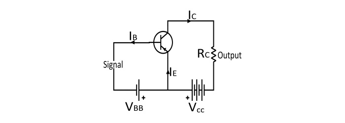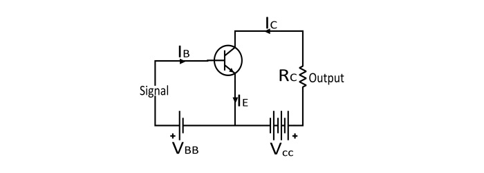 由於輸入電路具有低電阻(因為正向偏置),因此訊號電壓的微小變化會導致發射極電流發生巨大變化。由於電晶體的作用,集電極電流也會發生相同的變化。由於流過高負載電阻 RC 的集電極電流在其兩端產生較大的電壓降。這樣,施加到輸入電路的弱訊號在輸出電路中被放大,因此電晶體充當放大器。