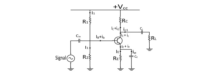 偏置和穩定電路 - 電阻 R1、R2 和 RE 構成放大器的偏置和穩定電路。偏置電路的功能是建立適當的工作點,否則輸入訊號負半周的一部分可能會在輸出端被切除。