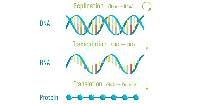 它是分子生物學中心法則中的一個關鍵步驟,該法則指出DNA中包含的資訊被轉錄成mRNA,然後翻譯成蛋白質。