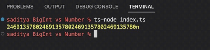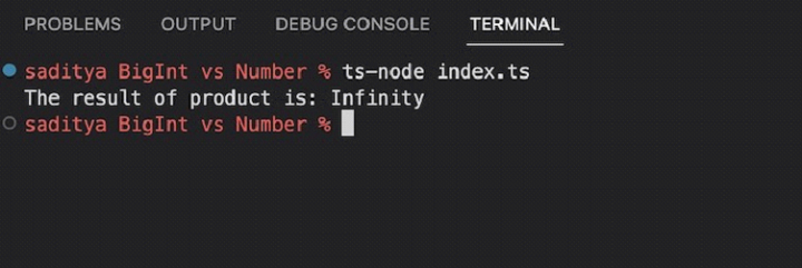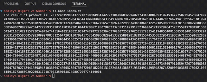 let largeNumber = 9007199254740991n; let result = largeNumber ** 100n; console.log(`The result of product is: ${result}`);
