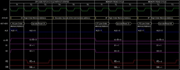 **總結** − 因此,此指令**RET**需要1個位元組、3個機器週期(操作碼提取、記憶體讀取、記憶體讀取)和10個T狀態才能執行,如時序圖所示。