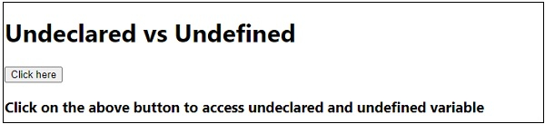<!DOCTYPE html> <html lang="en"> <head> <meta charset="UTF-8" /> <meta name="viewport" content="width=device-width, initial-scale=1.0" /> <title>Document</title> <style> body { font-family: "Segoe UI", Tahoma, Geneva, Verdana, sans-serif; } .result { font-size: 18px; font-weight: 500; color: blueviolet; } </style> </head> <body> <h1>Undeclared vs Undefined</h1> <div class="result"></div> <div class="result"></div> <button class="Btn">Click here</button> <h3>Click on the above button to access undeclared and undefined variable</h3> <script> let BtnEle = document.querySelector(".Btn"); let resEle = document.querySelectorAll(".result"); let a; BtnEle.addEventListener("click", () => { resEle[0].innerHTML += "Accessing undefined variable = " + a; try { resEle[1].innerHTML = b; } catch (err) { resEle[1].innerHTML = "Accessing undeclared variable = " + err; } }); </script> </body> </html>