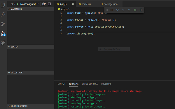 要使用偵錯程式,請選擇 App.js 檔案,然後從選項卡中選擇“執行”->“啟動除錯”。