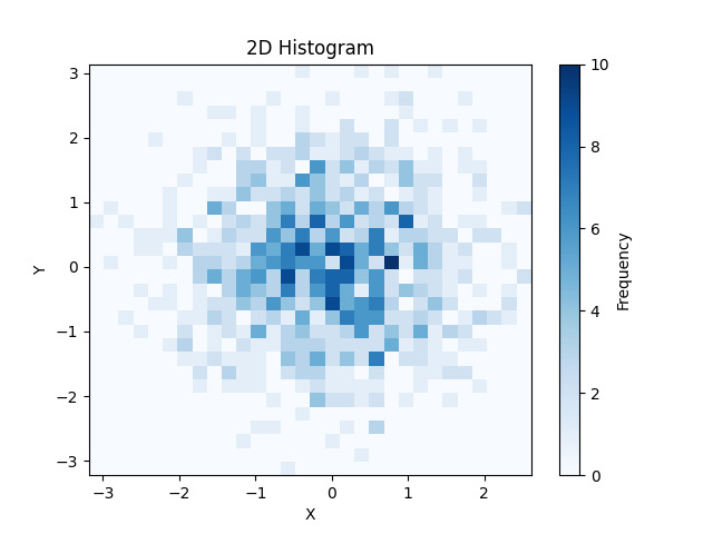 我們使用二維直方圖來表示兩個變數的聯合分佈。我們首先將資料劃分為矩形單元,並根據頻率為每個單元著色。二維直方圖也稱為熱圖。