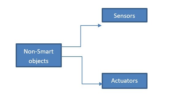 非智慧物件與智慧物件的相反。即,不具有智慧特徵和處理能力。我們可以說感測器和執行器是非智慧物件。它們是物聯網中必不可少的,可以讓人工自動化,無需人工干預。
