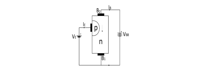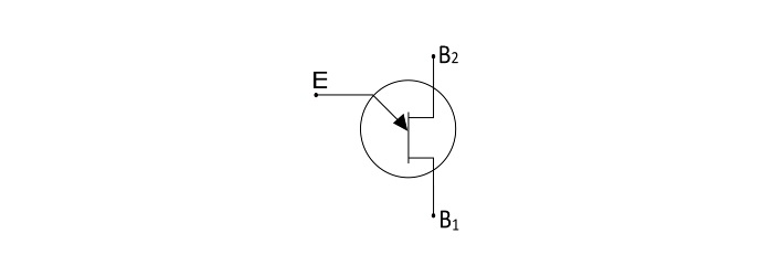 該器件只有一個 pn 結,因此它形成一個二極體。因為兩個基極引線是從二極體的一個部分引出的,所以該器件也稱為雙基二極體。