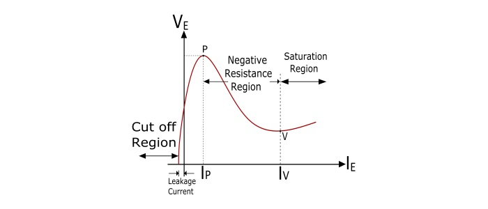在 VE 的特定值以上,發射極電流 (IE) 開始流動並增加,直到在 P 點達到峰值 (VP 和 IP)。