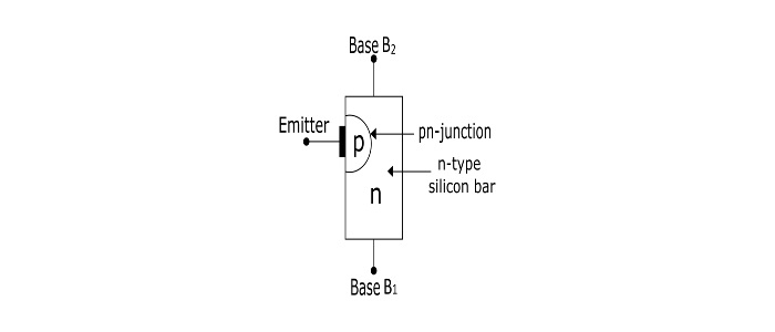 UJT 由一塊 n 型矽半導體棒組成,兩端各有一個電極。這些連線的端子稱為基極端 (B1 和 B2)。靠近基極 B2,在 p 型發射極和 n 型矽棒之間形成了一個 pn 結。該結的端子稱為發射極端 (E)。