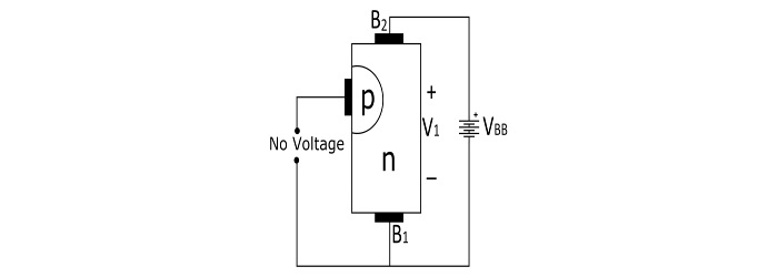 當在發射極開路的情況下施加電壓 VBB 時。在 n 型矽棒上建立一個電位梯度。由於發射極位於靠近基極 B2 的位置,因此 VBB 的大部分電壓出現在發射極和基極 B1 之間。發射極和 B1 之間的電壓 V1 在 pn 結上建立了一個反向偏置,發射極電流被截止,但由於少數載流子,從 B2 到發射極會流過一個小的洩漏電流。因此,器件處於斷態。