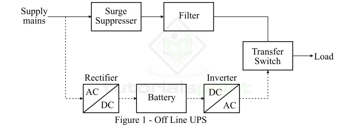 離線 UPS 也稱為備用 UPS。這種型別的 UPS 系統僅提供最基本的功能。在離線 UPS 的情況下,系統僅在電源主線出現故障時才開始執行。離線 UPS 的方框圖如圖 1 所示。
