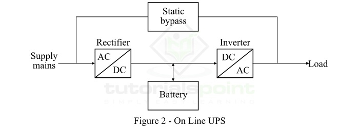 在電源主線故障的情況下,整流器電路變得不活動,電池中儲存的直流電由逆變器轉換為交流電並提供給負載。一旦電源恢復,整流器電路又開始為電池充電。系統中還提供了限流機制,以防止電池過熱。雖然,由於線上 ups 系統的設計和使用的元件,其價格略貴。