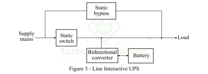 在正常工作條件下,負載透過交流電源和雙向轉換器的並聯連線供電。轉換器為電池充電,並在電源主線斷開的情況下也為負載提供交流電。在這種型別的 UPS 系統中,還提供了一個旁路,當 UPS 無法工作時,它將負載轉移到旁路交流輸入。線互動 UPS 系統非常適合中高功率額定負載。