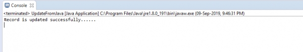 import java.sql.Connection; import java.sql.DriverManager; import java.sql.PreparedStatement; public class UpdateFromJava { public static void main(String[] args) { Connection con = null; PreparedStatement ps = null; try { con = DriverManager.getConnection("jdbc :mysql :// :3306/web?" + "useSSL=false", "root", "123456"); String query = "update DemoTable set FirstName=? where Id=? "; ps = con.prepareStatement(query); ps.setString(1, "Tom"); ps.setInt(2, 100); ps.executeUpdate(); System.out.println("Record is updated successfully......"); } catch (Exception e) { e.printStackTrace(); } } }