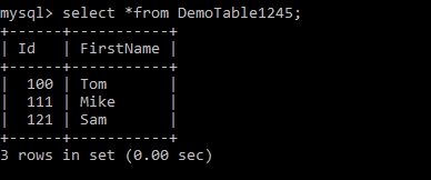 +------+-----------+ | Id | FirstName | +------+-----------+ | 100 | Tom | | 111 | Mike | | 121 | Sam | +------+-----------+ 3 rows in set (0.00 sec)