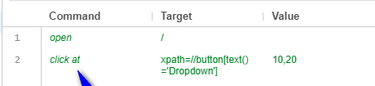 在 Selenium IDE 中,在測試指令碼編輯框中選擇一行。在命令欄位中輸入 click。要使用 id 定位符識別下拉選單,請輸入目標欄位。x 和 y 座標必須輸入在值欄位內。